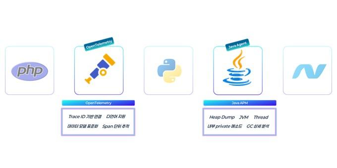 또 하나 눈여겨볼 점은, 오픈텔레메트리가 특정 기술이나 특정 벤더에 묶인 방식이 아니라는 점입니다. 지금의 서비스는 Java 하나로만 구성되지 않습니다. Node.js, Python, .NET, PHP처럼 여러 언어와 프레임워크가 함께 사용되고, 실행 환경도 VM과 컨테이너, 온프레미스와 클라우드가 혼재합니다.