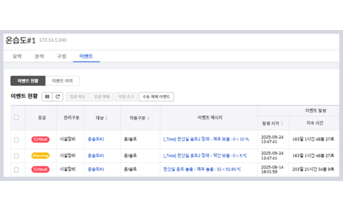 설비 동작 상태와 운전 이력을 기반으로 이상 징후를 조기에 감지하고 알람을 제공합니다. 또한 장비별·온도·이벤트 추이를 분석해 안정적인 전력 운영을 지원하며, 전산실 운영 중 발생할 수 있는 장애에 신속하게 대응할 수 있습니다.