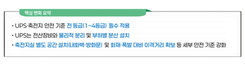 또한 UPS를 전산장비와 물리적으로 분리된 내화벽 공간에 설치하도록 하고, UPS 이중화 시에도 장애 확산을 방지하기 위해 부하별로 나눠 설치하도록 했습니다. 축전지실 분리와 이격거리, 내화벽·방화문 등 관련 세부 안전 기준*도 함께 강화되었습니다.