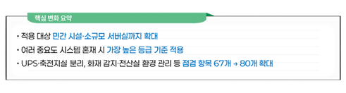 이에 따라 규모와 관계없이 정보시스템 운영시설이라면 강화된 안전 기준을 적용받게 되었습니다.
