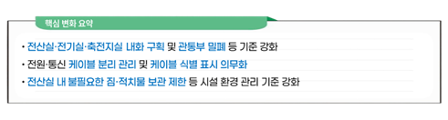 시설의 구조적 안전 기준도 강화되었습니다. 기존에는 건물 내진 설계나 방화구획, 소방 설비 등 일반적인 안전 기준 중심이었다면, 이번 개정에서는 전산실·전기실·축전지실의 내화 구획, 관통부 밀폐, 누설 방지 조치 등 보다 구체적인 구조 기준이 명시되었습니다.