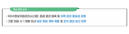 매년 점검 결과를 정보자원관리시스템(IRM)에 등록하는 기존 이력 관리 체계는 유지되지만, UPS·전력·시설 기준까지 점검 대상에 포함되면서 이력 관리의 중요성이 더욱 커졌습니다.