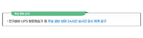 기존에는 종합상황실을 통해 전산실·통신장비실·전기실의 운영 상태를 확인하는 수준의 감시 체계를 규정하고 있었습니다. 그러나 이번 개정에서는 전기설비, 항온항습기, UPS 등 주요 설비의 상태와 이상 여부를 24시간 실시간으로 감시하고 필요 시 제어할 수 있는 시설 감시·제어 시스템을 갖추도록 명시되었습니다.