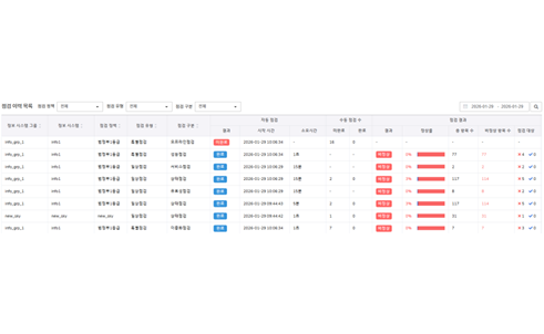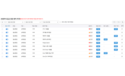 특히 비정상 항목은 색상 강조나 그래프를 통해 시각적으로 강조되어 담당자가 신속하게 판단할 수 있도록 지원합니다. 또한 자동화가 어려운 수동 점검 항목의 경우, 점검 미완료 상태를 별도로 표시해 담당자가 누락된 작업을 항목 단위로 즉시 인지하게 합니다. 이를 통해 개별 점검 상태를 일일이 대조하는 번거로운 과정 없이도, 전체 점검 공정을 빈틈없이 관리할 수 있습니다.